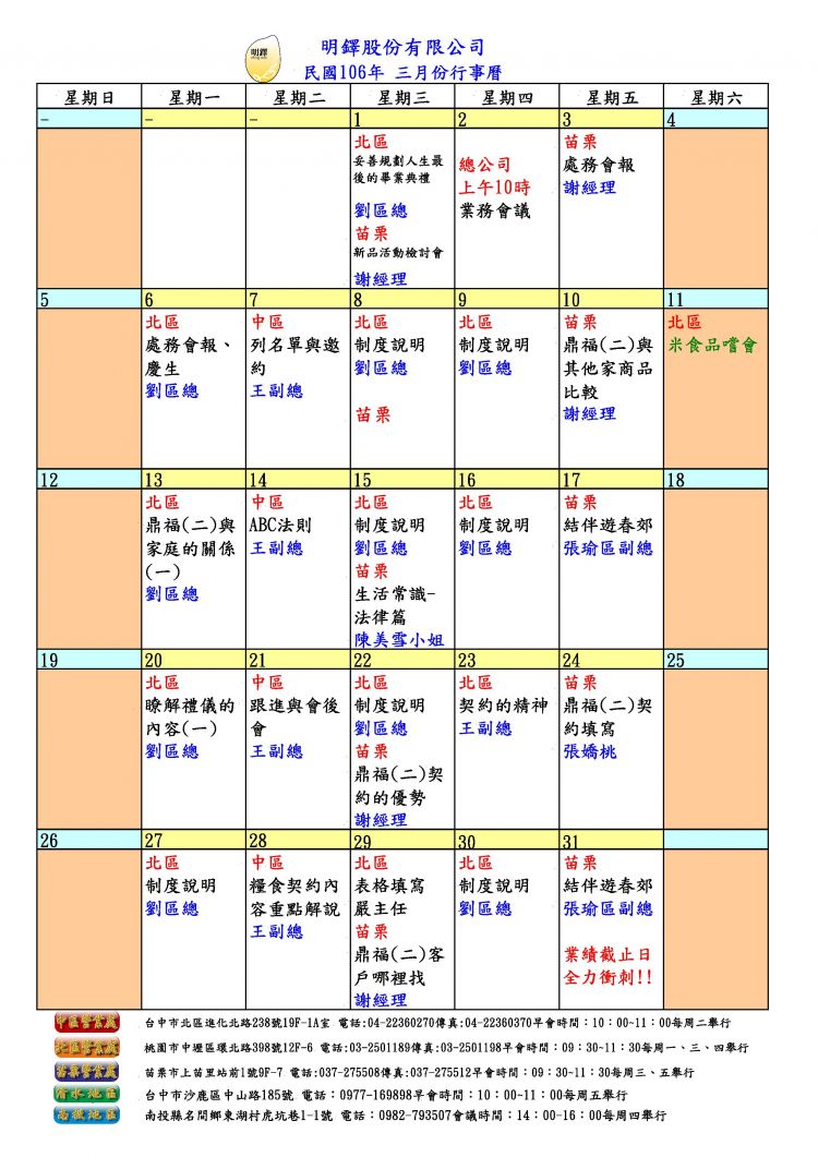 106年3月份行事曆