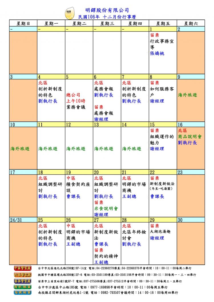 106年12月份行事曆