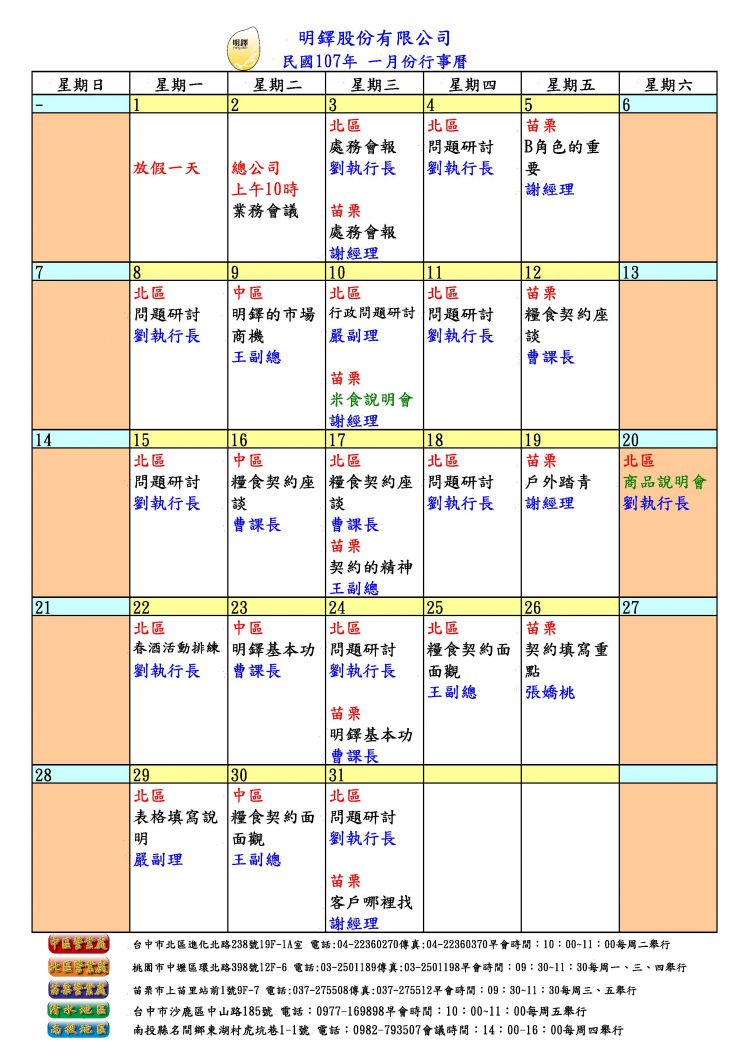107年1月份行事曆